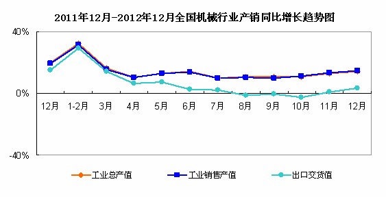 統(tǒng)計數(shù)據(jù)顯示,2012年1-12月,全國機(jī)械工業(yè)經(jīng)濟(jì)運行速度同比持續(xù)呈現(xiàn)回升的態(tài)勢。12月份,工業(yè)總產(chǎn)值的累計同比增速為14.24%;工業(yè)銷售產(chǎn)值的累計同比增速為14.64%,出口交貨值的累計同比增速為3.26%。
